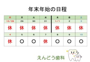 年末年始は、12月29日(日)~1月5日(日)まで休診となります。